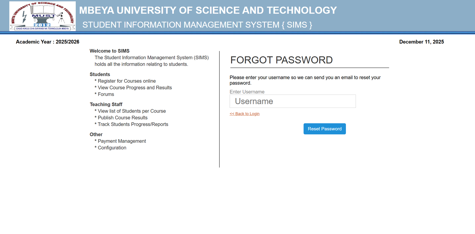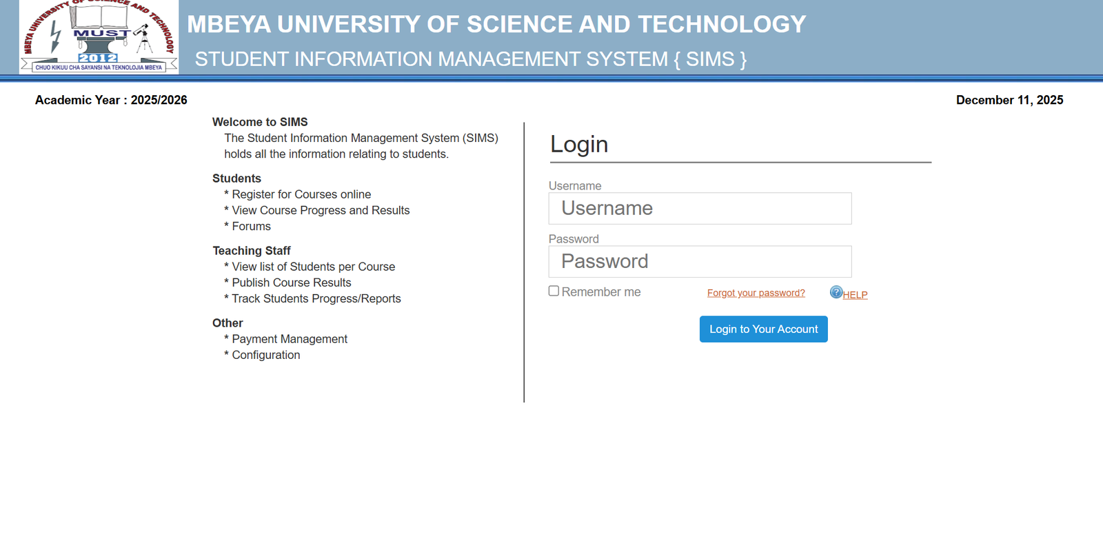 Sims Must stands for Student Information Management System, the central academic data hub for Mbeya University of Science and Technology.